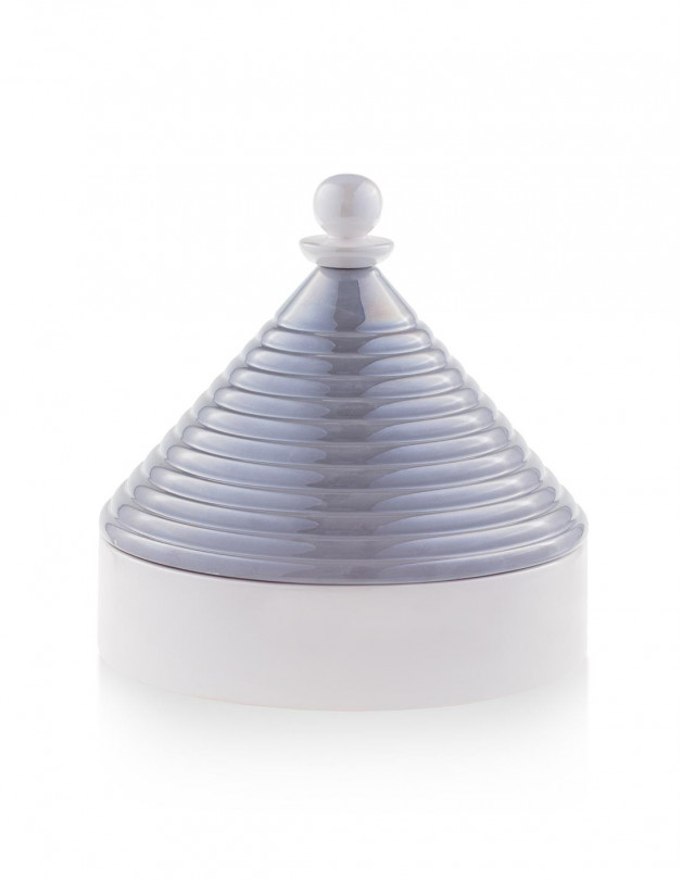 La scatola portaoggetti a forma di trullo di Emò Italia, presente un raffinato coperchio grigio dalla finitura splendente.
