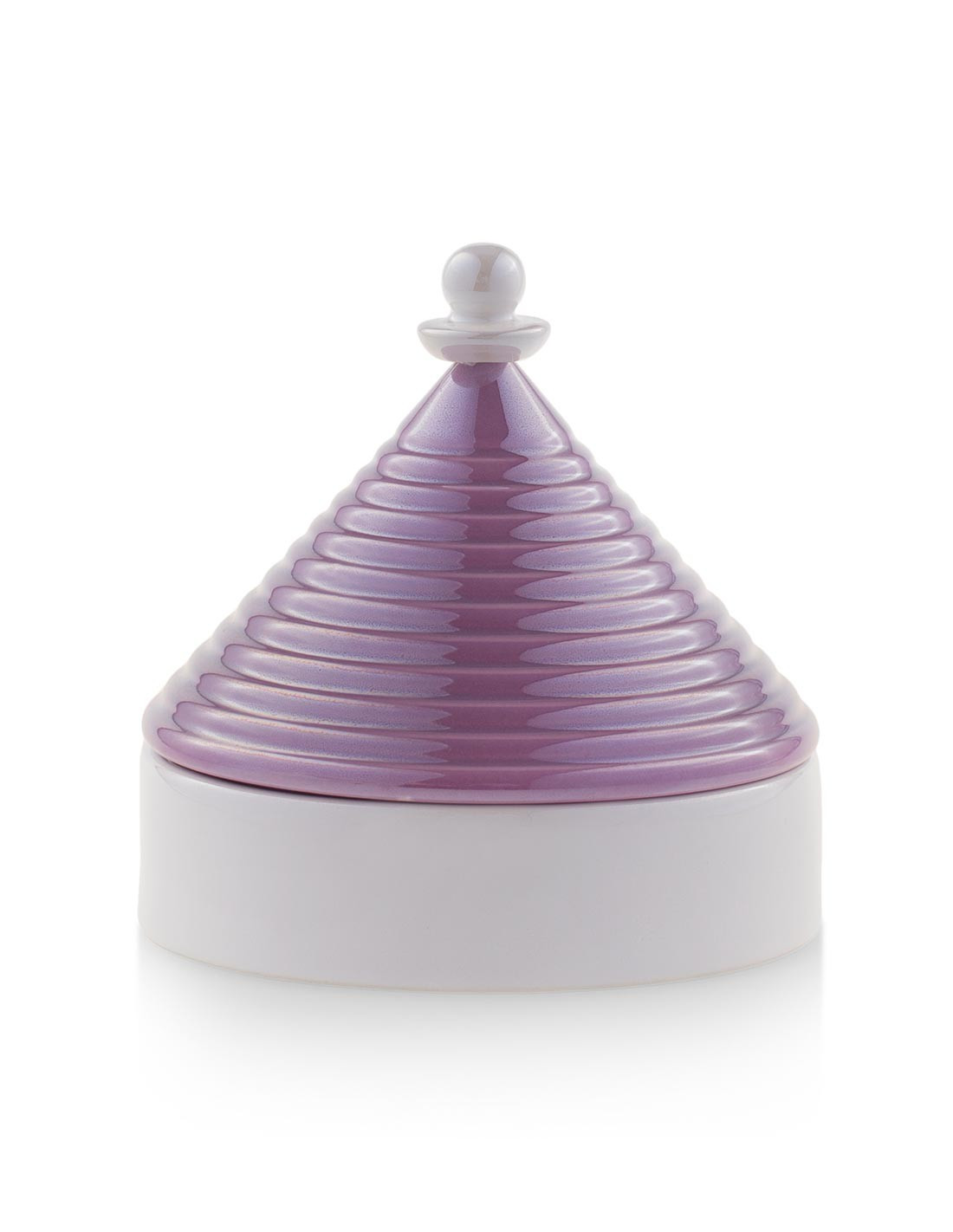 Dal delicato tocco cromatico, la scatola portaoggetti lilla a forma di trullo di Emò Italia si ispira alle architetture ancestrali pugliesi.