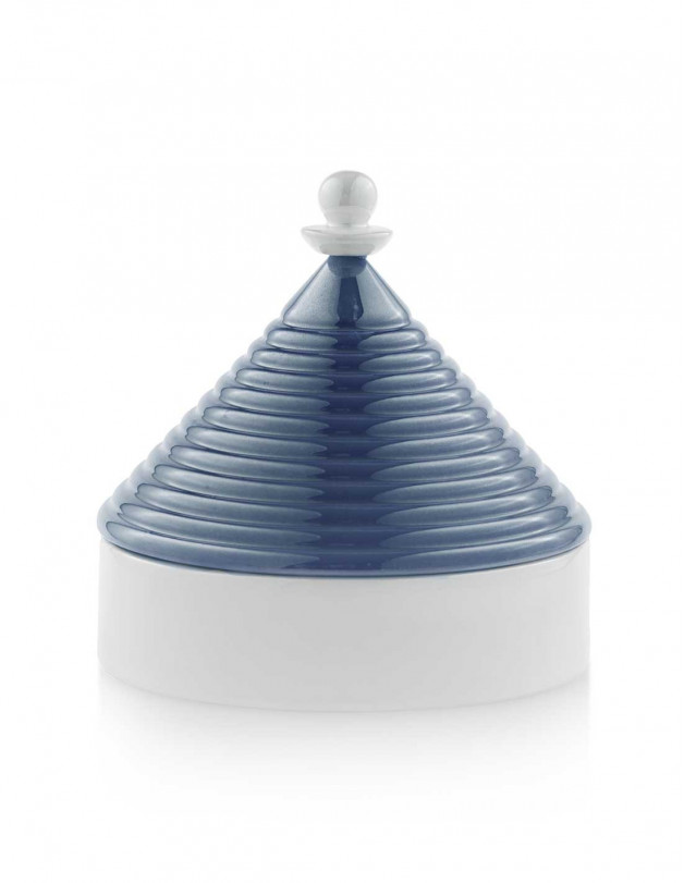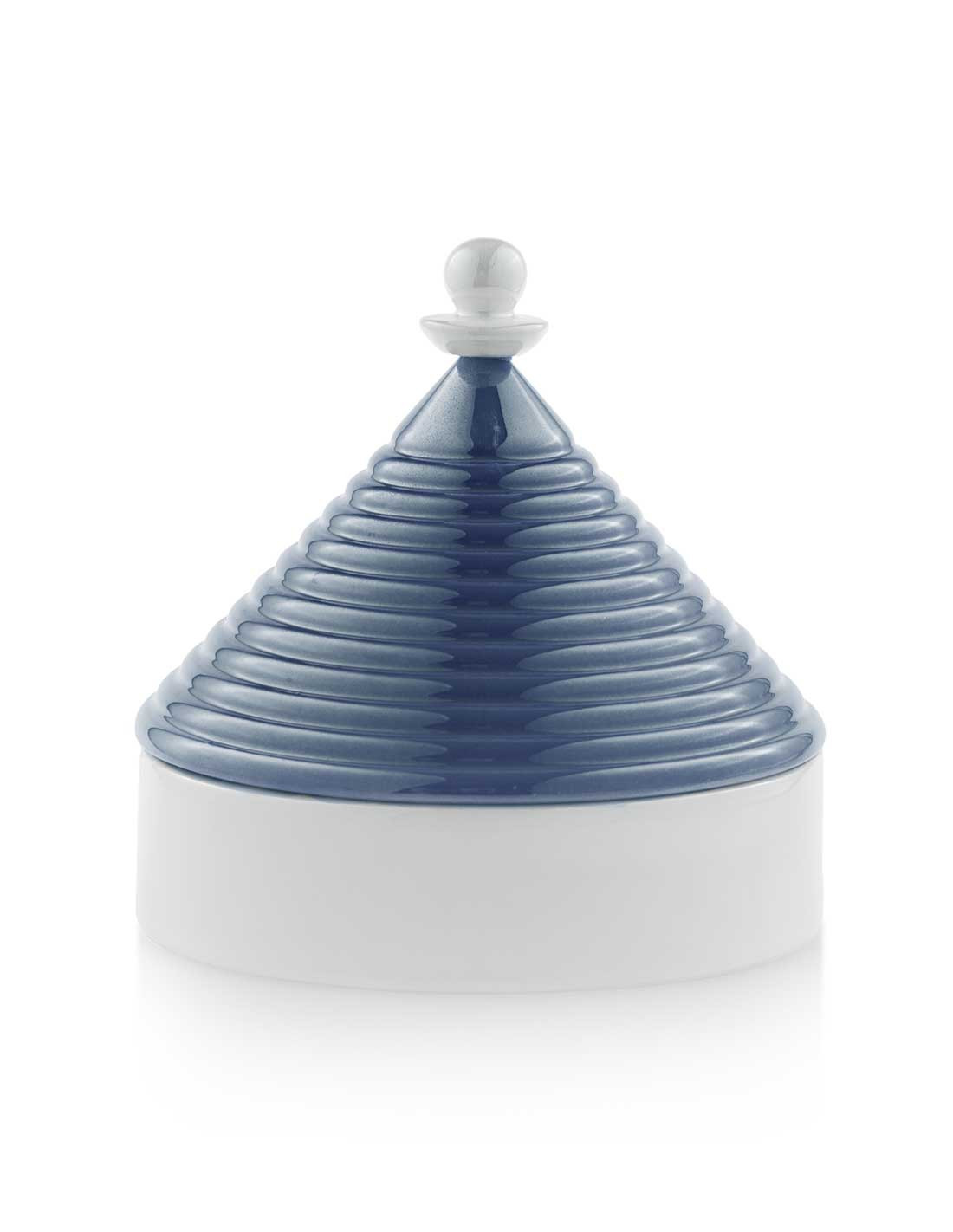 La scatola portaoggetti a forma di trullo di Emò Italia ha un coperchio dal colore moda emozionante: ottanio.